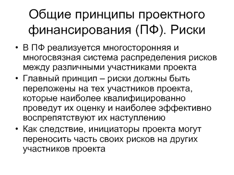 Слайд 5Общие принципы проектного финансирования (ПФ). Риски