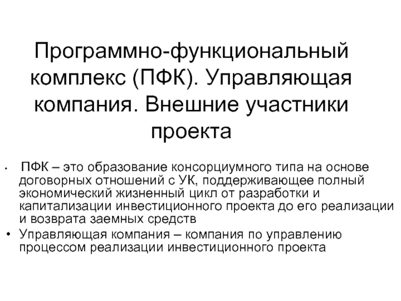 Слайд 10Программно-функциональный комплекс (ПФК). Управляющая компания. Внешние участники проекта