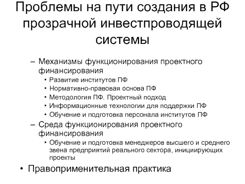 Слайд 13Проблемы на пути создания в РФ прозрачной инвестпроводящей системы