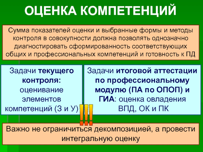 Сумма показателей оценки и выбранные формы и методы контроля в совокупности должна позволять однозначно диагностировать сформированность соответствующих общих и профессиональных компетенций и готовность к ПД