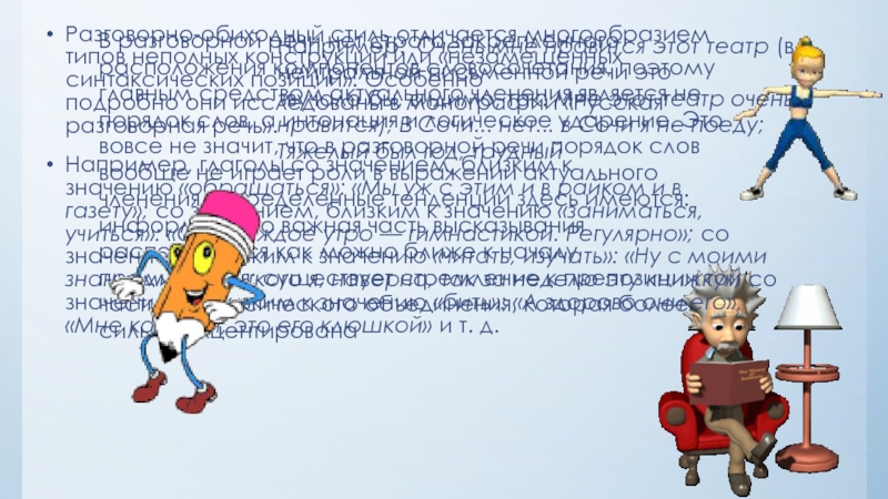В разговорной речи нет строго закрепленного расположения компонентов словосочетания, поэтому главным средством актуального членения является не порядок слов, а интонация и логическое ударение. Это вовсе не значит, что в разговорной речи порядок слов вообще не играет роли в выражении актуального членения. Определенные тенденции здесь имеются: информативно важная часть высказывания располагается как можно ближе к началу предложения; существует стремление к препозиции той части синтаксического объединения, которая более сильно акцентирована