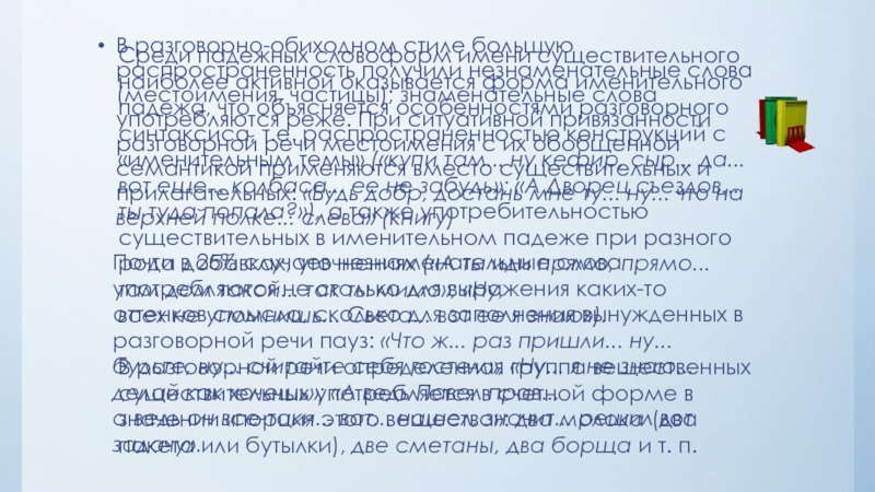 Среди падежных словоформ имени существительного наиболее активной оказывается форма именительного падежа, что объясняется особенностями разговорного синтаксиса, т.е. распространенностью конструкций с «именительным темы» («купи там... ну кефир, сыр... да... вот еще... колбаса... ее не забудь»; «А Дворец съездов...