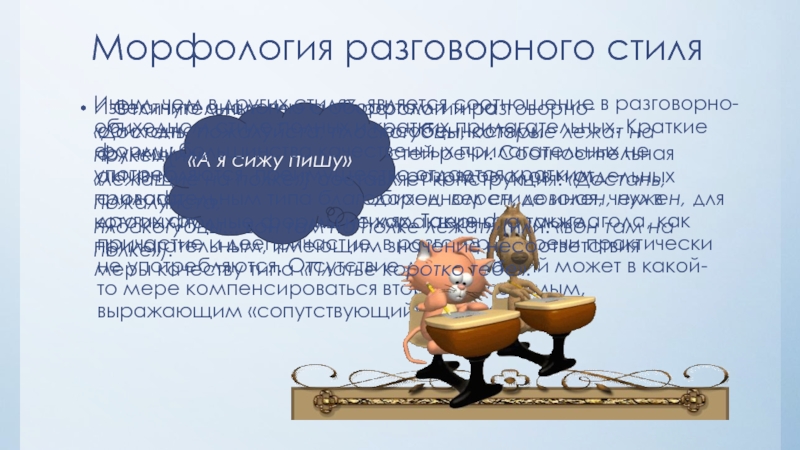 В разговорном стиле обычно употребляются слова с конкретным значением (кладовка, раздевалка), названия лиц (болтун, лежебока) и значительно реже — слова с отвлеченным значением (верхоглядство, похвальба, бессмыслица)