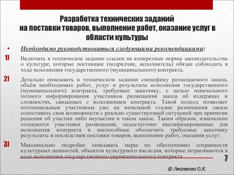 Включать в техническое задание ссылки на конкретные нормы законодательства о культуре, которые поставщик (подрядчик, исполнитель) обязан соблюдать в ходе исполнения государственного (муниципального) контракта.