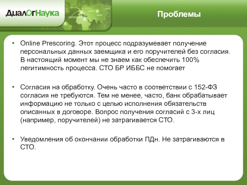 Согласия на обработку. Очень часто в соответствии с 152-ФЗ согласия не требуются. Тем не менее, часто, банк обрабатывает информацию не только с целью исполнения обязательств описанных в договоре. Вопрос получения согласий с 3-х лиц (например, поручителей) не затрагивается СТО.