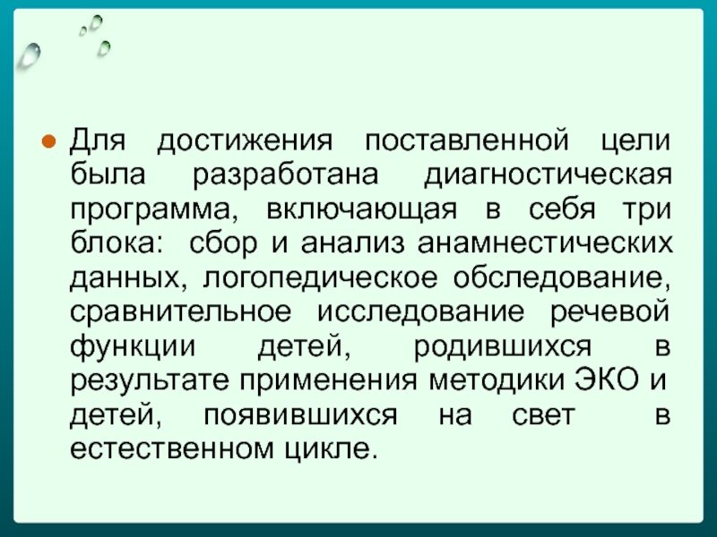 себя три блока: сбор и анализ анамнестических данных, логопедическое обследование, сравнительное исследование речевой функции детей, родившихся в результате применения методики ЭКО и детей, появившихся на свет в естественном цикле.