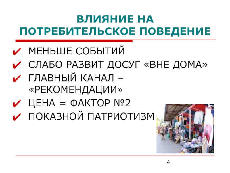 Слайд 4ВЛИЯНИЕ НА ПОТРЕБИТЕЛЬСКОЕ ПОВЕДЕНИЕ