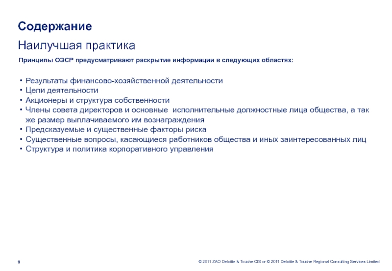 «своевременному раскрытию подлежит полная и точная информация по всем существенным вопросам, касающимся корпорации, включая ее финансовое положение, результаты деятельности, структуру собственности и управление»