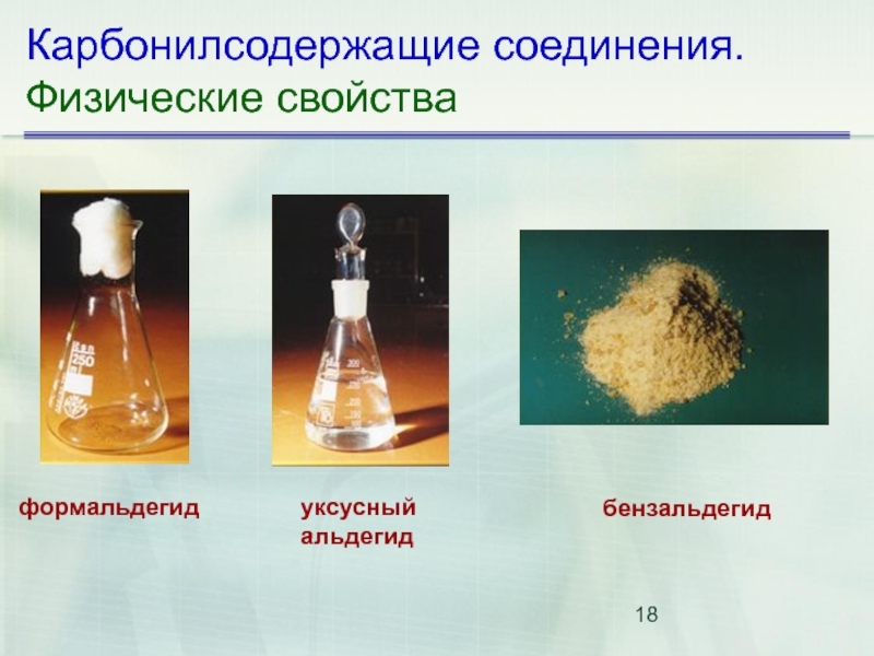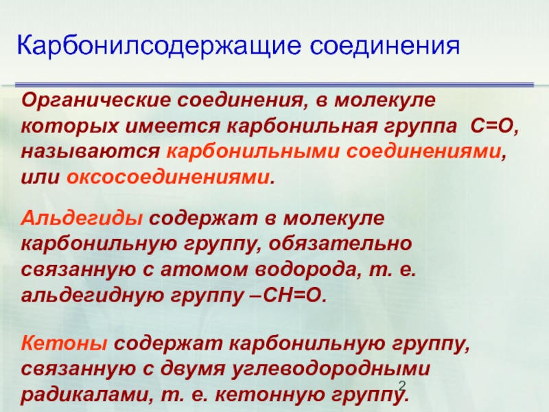 Альдегиды содержат в молекуле карбонильную группу, обязательно связанную с атомом водорода, т. е. альдегидную группу –СН=O.