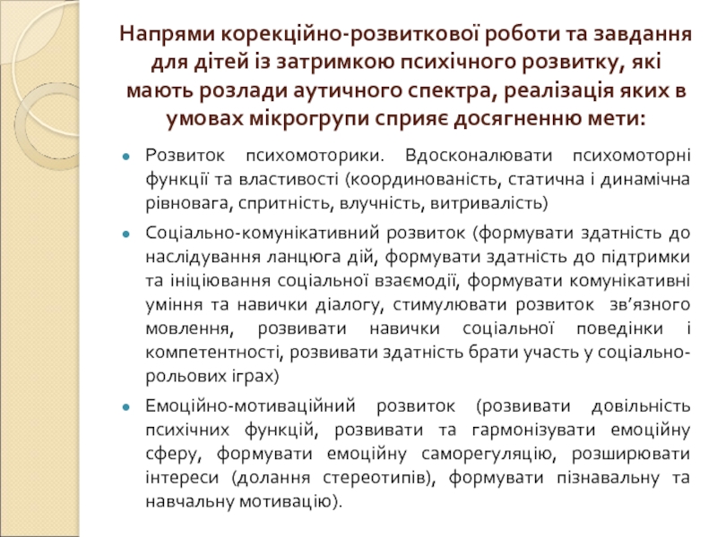 Слайд 33Напрями корекційно-розвиткової роботи та завдання для дітей із затримкою психічного розвитку,