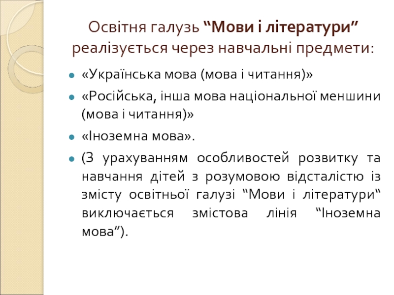 Слайд 14Освітня галузь “Мови і літератури” реалізується через навчальні предмети:
