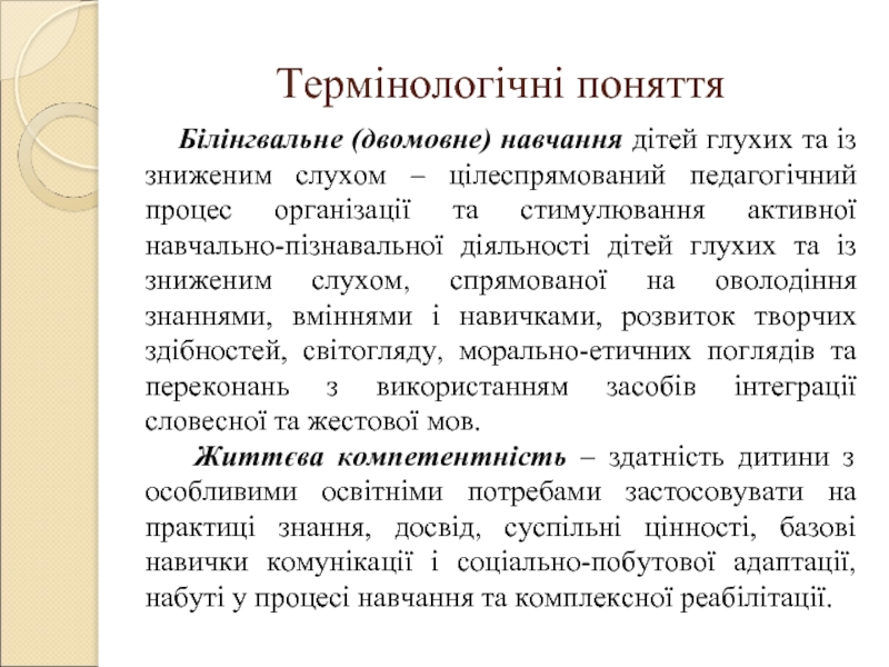 слухом – цілеспрямований педагогічний процес організації та стимулювання активної навчально-пізнавальної діяльності дітей глухих та із зниженим слухом, спрямованої на оволодіння знаннями, вміннями і навичками, розвиток творчих здібностей, світогляду, морально-етичних поглядів та переконань з використанням засобів інтеграції словесної та жестової мов.