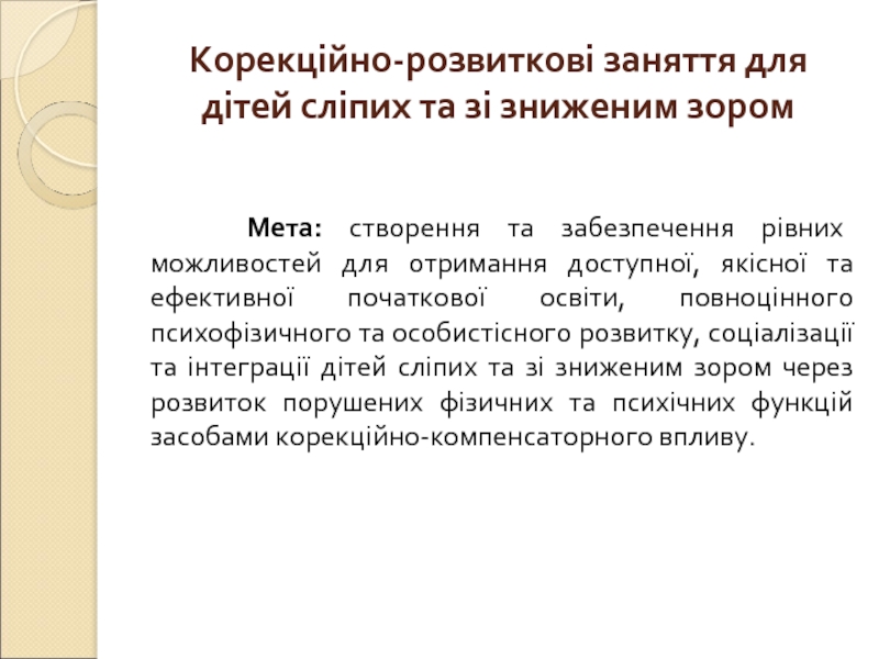 та виправлення функцій зору, подолання вторинних порушень пізнавальної, орієнтувальної діяльності, мовлення, фізичного розвитку