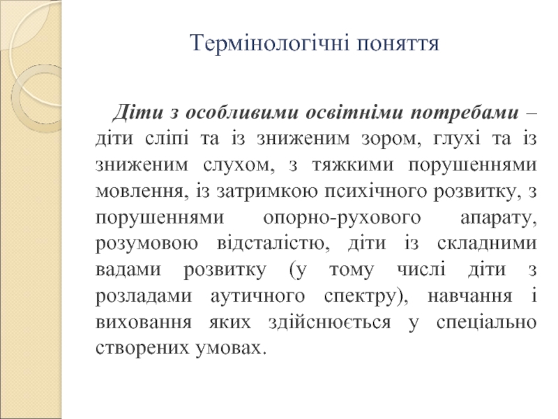 та із зниженим зором, глухі та із зниженим слухом, з тяжкими порушеннями мовлення, із затримкою психічного розвитку, з порушеннями опорно-рухового апарату, розумовою відсталістю, діти із складними вадами розвитку (у тому числі діти з розладами аутичного спектру), навчання і виховання яких здійснюється у спеціально створених умовах.