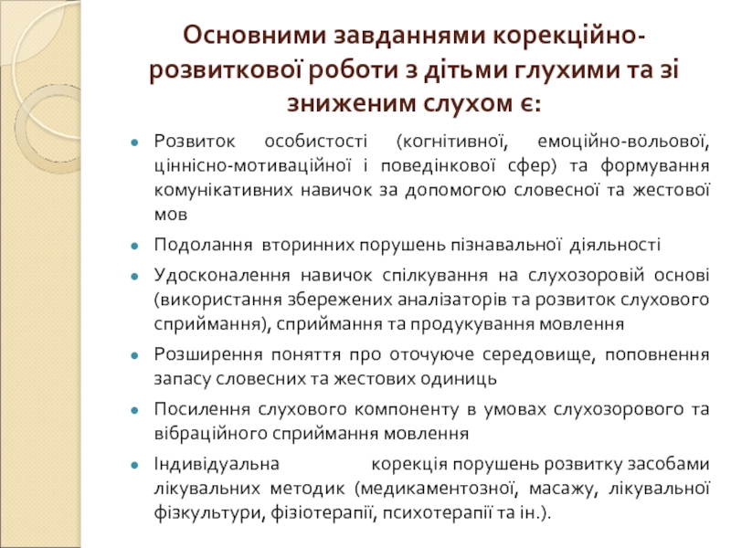 Слайд 20Основними завданнями корекційно-розвиткової роботи з дітьми глухими та зі зниженим слухом є: