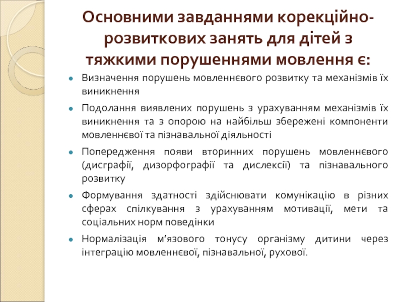 Слайд 22Основними завданнями корекційно-розвиткових занять для дітей з тяжкими порушеннями мовлення є: