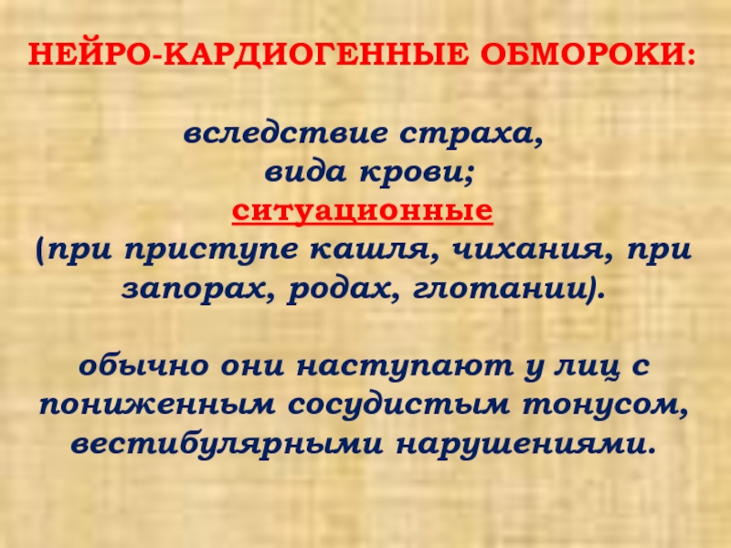 Слайд 7НЕЙРО-КАРДИОГЕННЫЕ ОБМОРОКИ:
