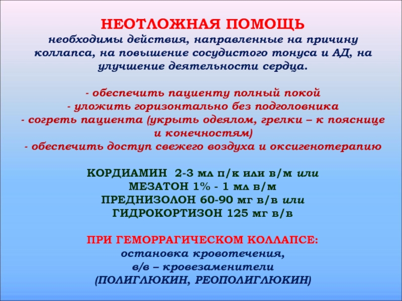 необходимы действия, направленные на причину коллапса, на повышение сосудистого тонуса