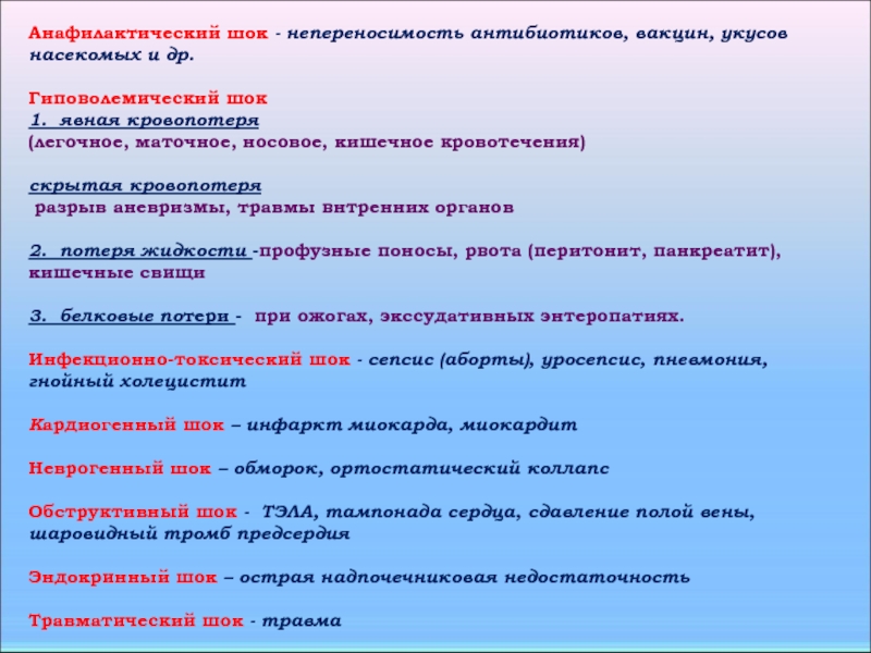 Слайд 21Анафилактический шок - непереносимость антибиотиков, вакцин, укусов насекомых и др.