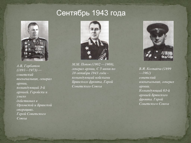 М.М. Попов (1902 —1969), генерал армии, С 5 июня по 10 октября 1943 года -командующий войсками Брянского фронта, Герой Советского Союза