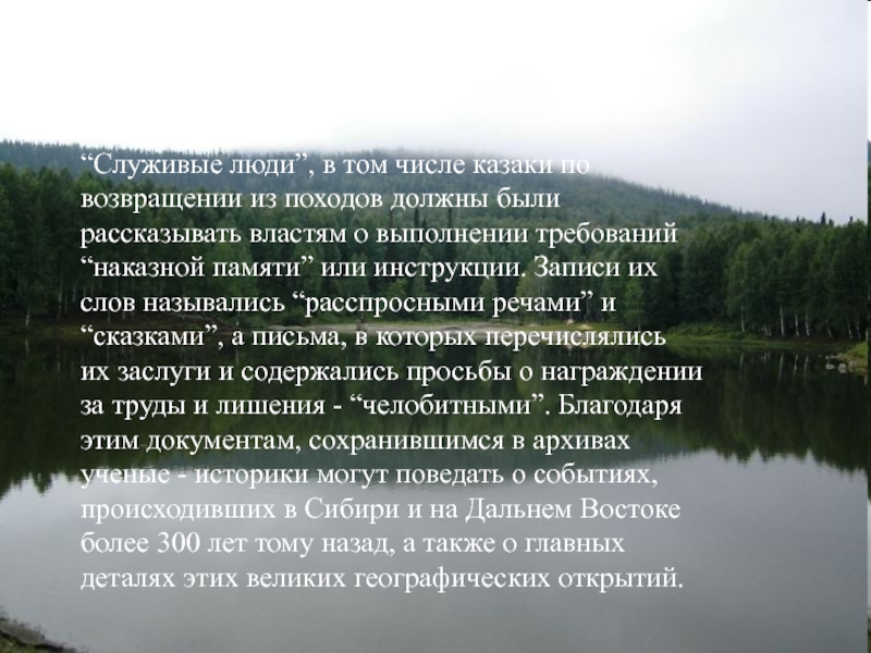 “Служивые люди”, в том числе казаки по возвращении из походов должны были рассказывать властям о выполнении требований “наказной памяти” или инструкции. Записи их слов назывались “расспросными речами” и “сказками”, а письма, в которых перечислялись их заслуги и содержались просьбы о награждении за труды и лишения - “челобитными”. Благодаря этим документам, сохранившимся в архивах ученые - историки могут поведать о событиях, происходивших в Сибири и на Дальнем Востоке более 300 лет тому назад, а также о главных деталях этих великих географических открытий.