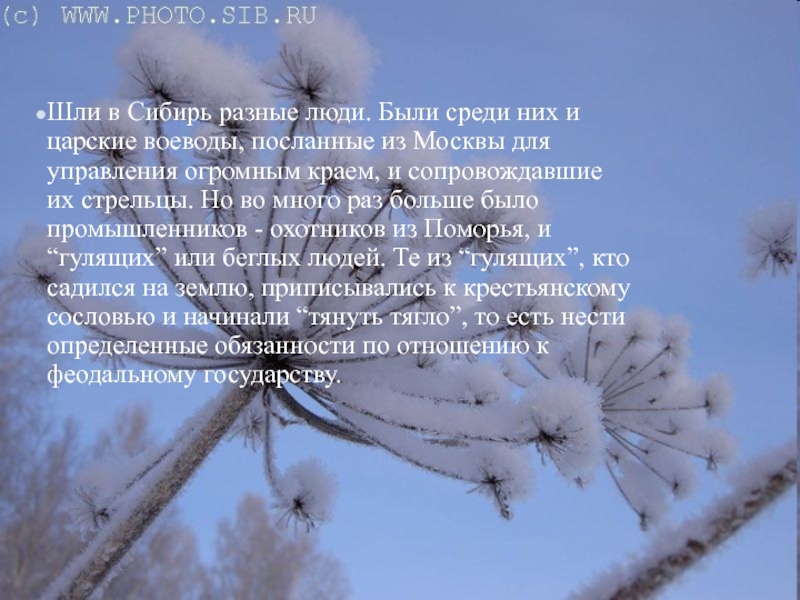 Шли в Сибирь разные люди. Были среди них и царские воеводы, посланные из Москвы для управления огромным краем, и сопровождавшие их стрельцы. Но во много раз больше было промышленников - охотников из Поморья, и “гулящих” или беглых людей. Те из “гулящих”, кто садился на землю, приписывались к крестьянскому сословью и начинали “тянуть тягло”, то есть нести определенные обязанности по отношению к феодальному государству.