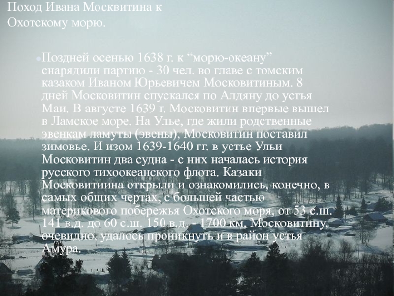 Поздней осенью 1638 г. к “морю-океану” снарядили партию - 30 чел. во главе с томским казаком Иваном Юрьевичем Московитиным. 8 дней Московитин спускался по Алдяну до устья Маи. В августе 1639 г. Московитин впервые вышел в Ламское море. На Улье, где жили родственные эвенкам ламуты (эвены), Московитин поставил зимовье. И изом 1639-1640 гг. в устье Ульи Московитин два судна - с них началась история русского тихоокеанского флота. Казаки Московитиина открыли и ознакомились, конечно, в самых общих чертах, с большей частью материкового побережья Охотского моря, от 53 с.ш. 141 в.д. до 60 с.ш. 150 в.д. - 1700 км, Московитину, очевидно, удалось проникнуть и в район устья Амура.