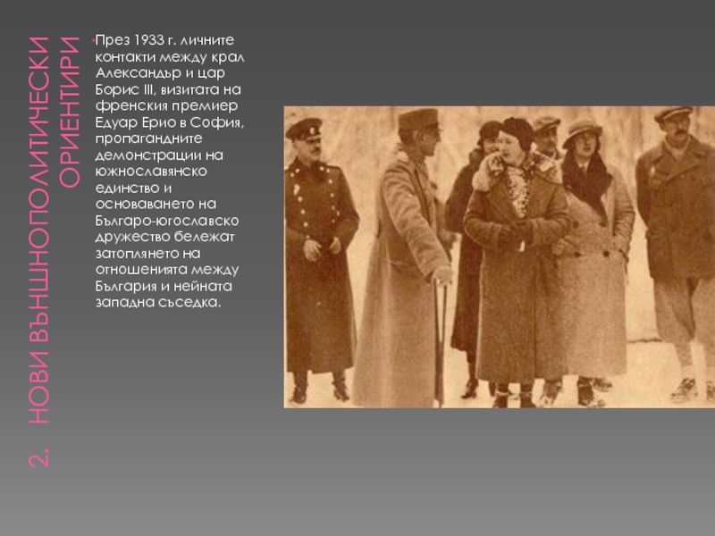 цар Борис III, визитата на френския премиер Едуар Ерио в София, пропагандните демонстрации на южнославянско единство и основаването на Българо-югославско дружество бележат затоплянето на отношенията между България и нейната западна съседка.