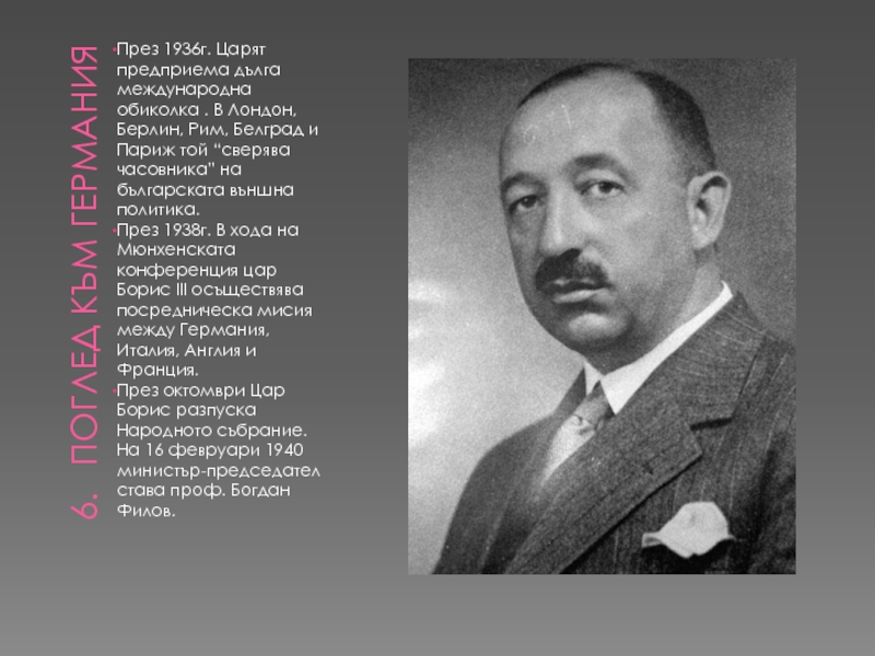 През 1938г. В хода на Мюнхенската конференция цар Борис III осъществява посредническа мисия между Германия, Италия, Англия и Франция.