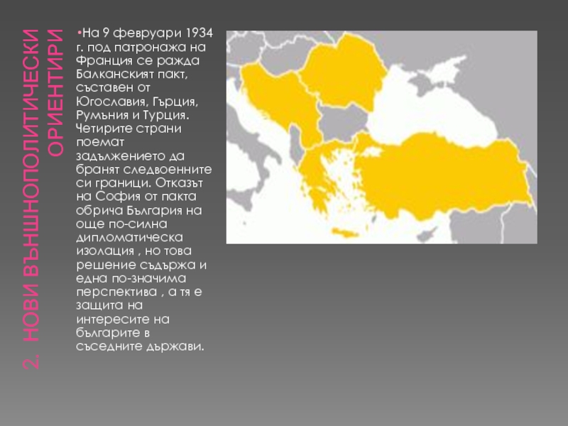 се ражда Балканският пакт, съставен от Югославия, Гърция, Румъния и Турция.Четирите страни поемат задължението да бранят следвоенните си граници. Отказът на София от пакта обрича България на още по-силна дипломатическа изолация , но това решение съдържа и една по-значима перспектива , а тя е защита на интересите на българите в съседните държави.