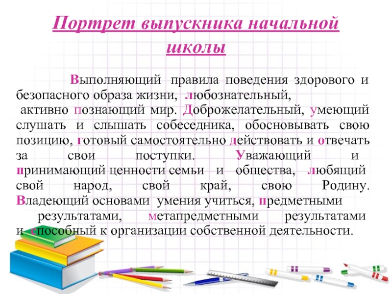активно познающий мир. Доброжелательный, умеющий слушать и слышать собеседника, обосновывать свою позицию, готовый самостоятельно действовать и отвечать за свои поступки. Уважающий и принимающий ценности семьи и общества, любящий свой народ, свой край, свою Родину. Владеющий основами  умения учиться, предметными