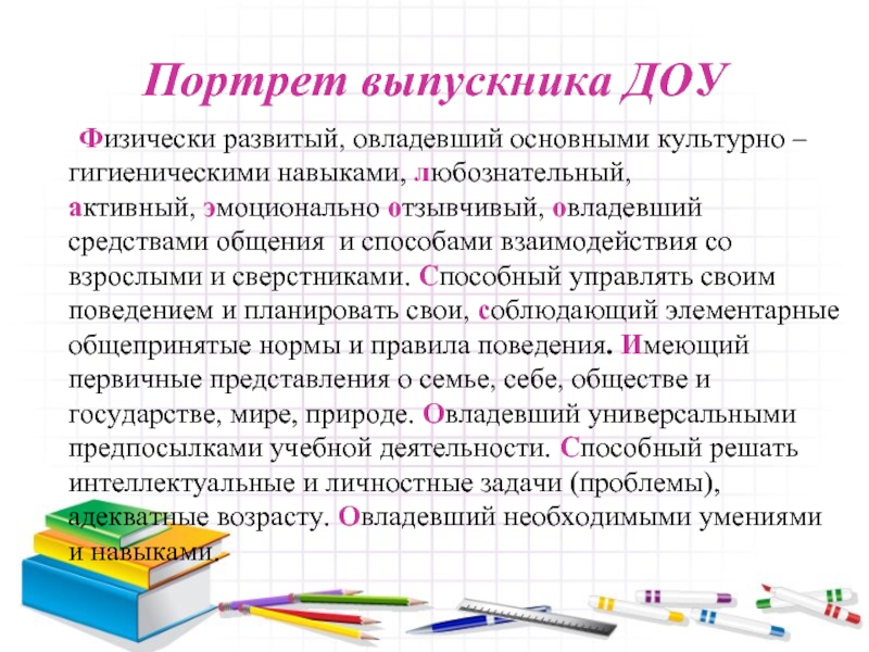гигиеническими навыками, любознательный, активный, эмоционально отзывчивый, овладевший средствами общения и способами взаимодействия со взрослыми и сверстниками. Способный управлять своим поведением и планировать свои, соблюдающий элементарные общепринятые нормы и правила поведения. Имеющий первичные представления о семье, себе, обществе и государстве, мире, природе. Овладевший универсальными предпосылками учебной деятельности. Способный решать интеллектуальные и личностные задачи (проблемы), адекватные возрасту. Овладевший необходимыми умениями и навыками.