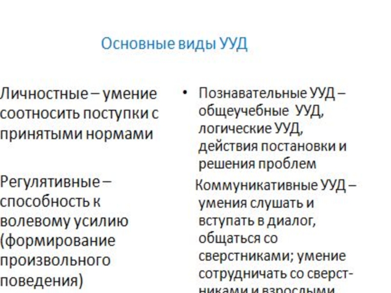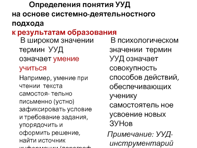 В психологическом значении термин УУД означает совокупность способов действий, обеспечивающих ученику самостоятель ное усвоение новых ЗУНов