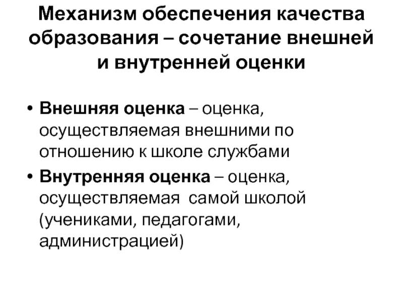 Слайд 8Механизм обеспечения качества образования – сочетание внешней и внутренней оценки