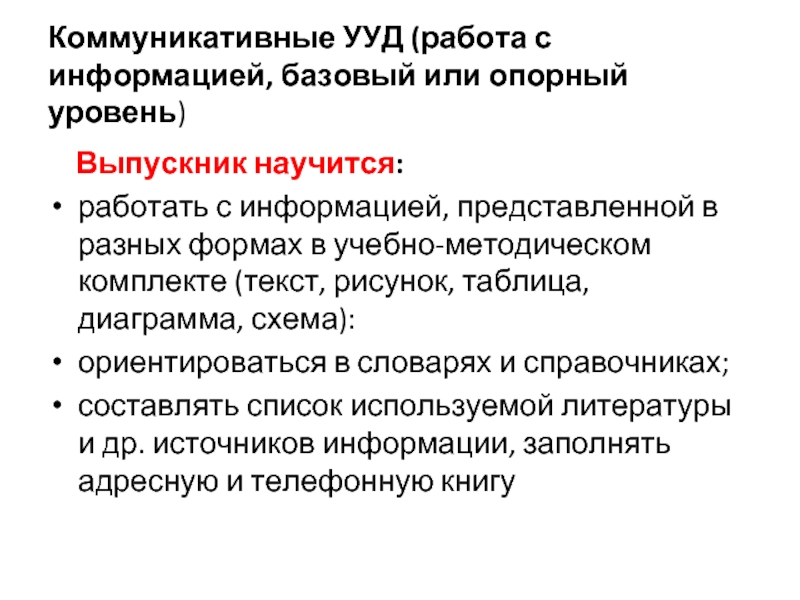 Слайд 15Коммуникативные УУД (работа с информацией, базовый или опорный уровень)