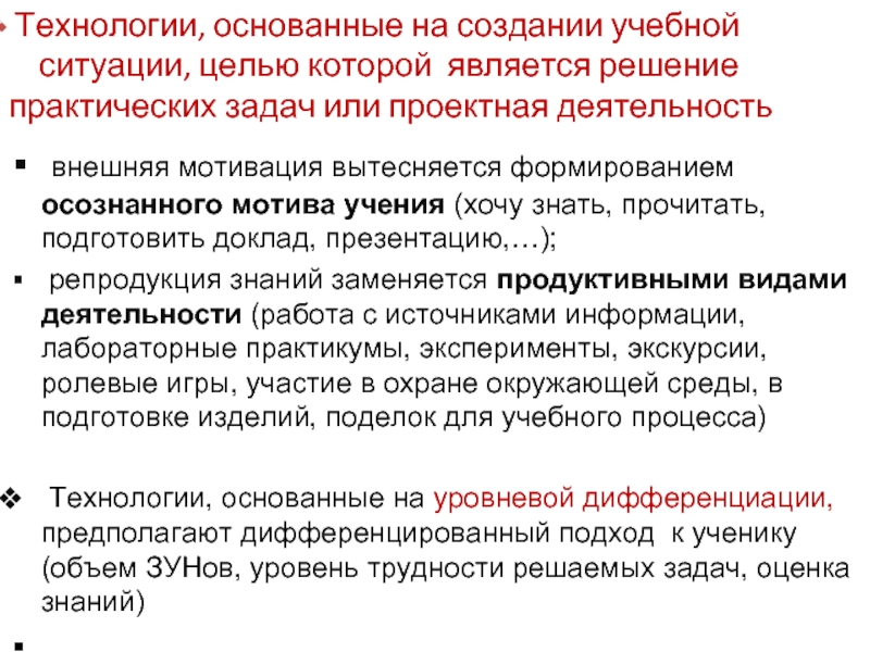 Технологии, основанные на уровневой дифференциации, предполагают дифференцированный подход к ученику (объем ЗУНов, уровень трудности решаемых задач, оценка знаний)