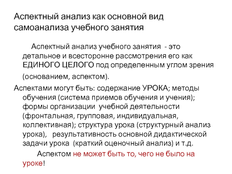 Слайд 44Аспектный анализ как основной вид самоанализа учебного занятия