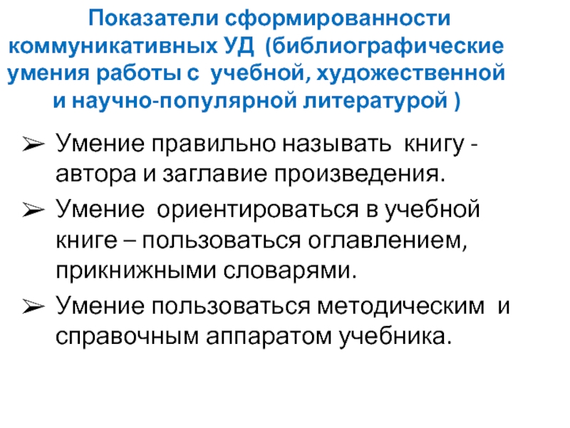 Слайд 39 Показатели сформированности коммуникативных УД (библиографические умения работы с