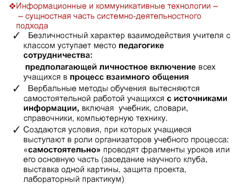Безличностный характер взаимодействия учителя с классом уступает место педагогике сотрудничества: