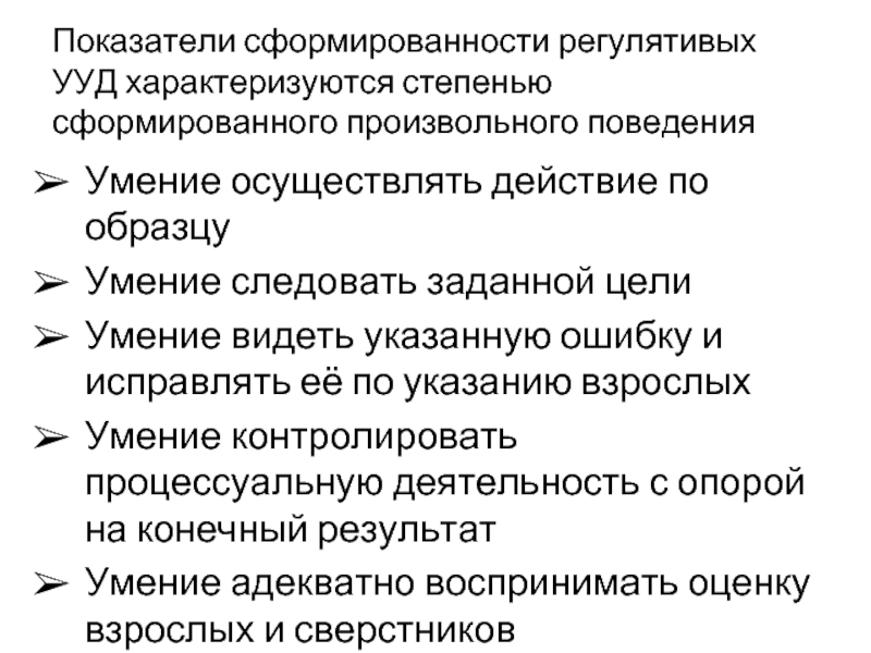 Слайд 38Показатели сформированности регулятивых УУД характеризуются степенью сформированного произвольного поведения