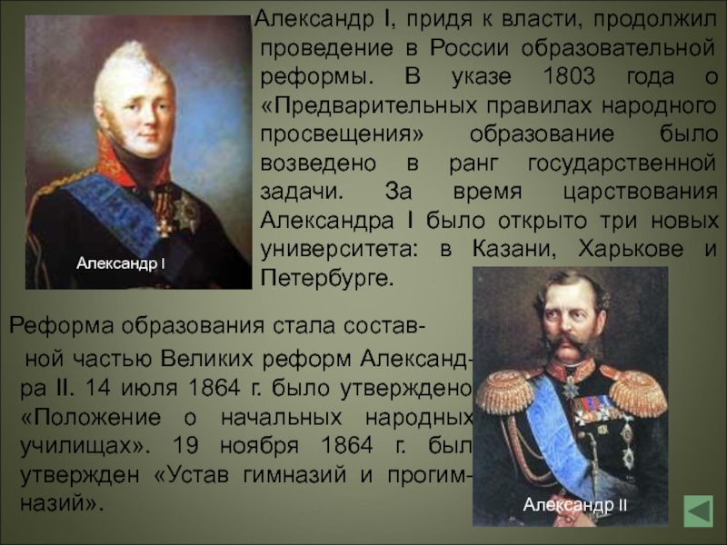 ной частью Великих реформ Александ-ра II. 14 июля 1864 г. было утверждено «Положение о начальных народных училищах». 19 ноября 1864 г. был утвержден «Устав гимназий и прогим-назий».
