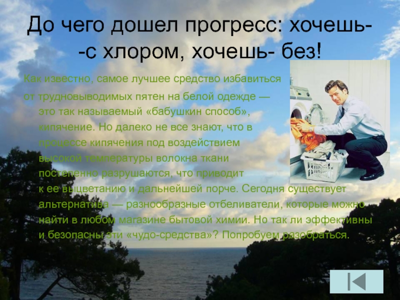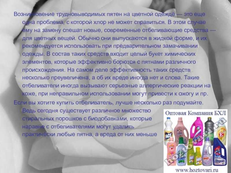 Инструкция на упаковку нанесена не просто так. Ее следует читать. Сколь не банальна эта рекомендация, очень многие ею пренебрегают — насыпают или наливают отбеливатель «на глазок» и ждут, когда же произойдет чудо, ткань отбелится, пятна исчезнут, цвета станут ярче. Но при таком подходе к делу вас может ожидать «чудо» другого рода: в лучшем случае — отсутствие какого-либо эффекта, в худшем — испорченная вещь. Поэтому прежде чем приступить к отбеливанию, обязательно прочтите инструкцию и уясните три важных момента: тип ткани, для которых предназначено средство, температурный режим, необходимость совмещения с порошком и дозировку (которая для разных средств может отличаться в 2—3 раза). Одним словом, для достижения желаемого результата не пожалейте 5 минут на изучение инструкции.