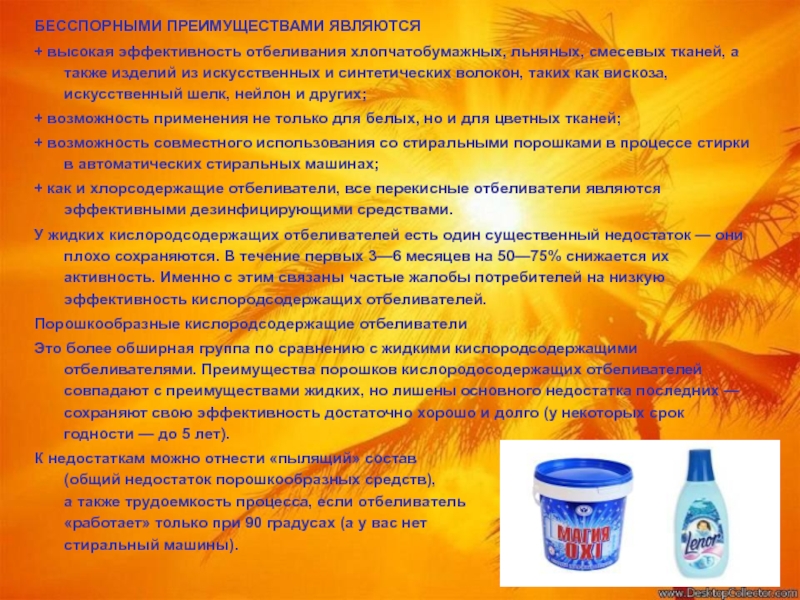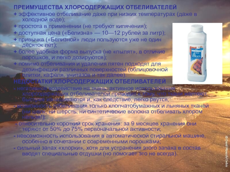 Это особенно актуально для жидких отбеливателей (которые значительно снижают эффективность уже через 3—4 месяца после выпуска). Срок годности порошкообразных средств больше — от 9 месяцев до 5 лет, по истечении которого они теряют отбеливающие свойства.
