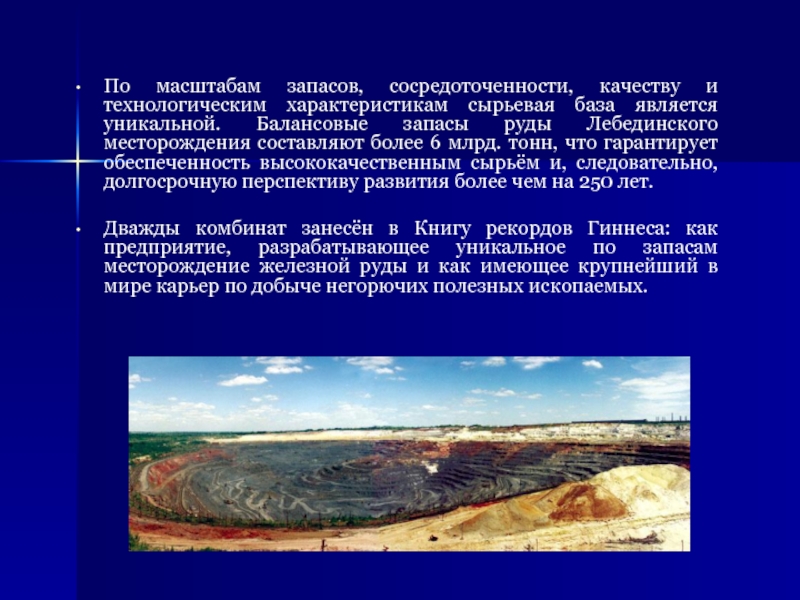 уникальной. Балансовые запасы руды Лебединского месторождения составляют более 6 млрд. тонн, что гарантирует обеспеченность высококачественным сырьём и, следовательно, долгосрочную перспективу развития более чем на 250 лет.