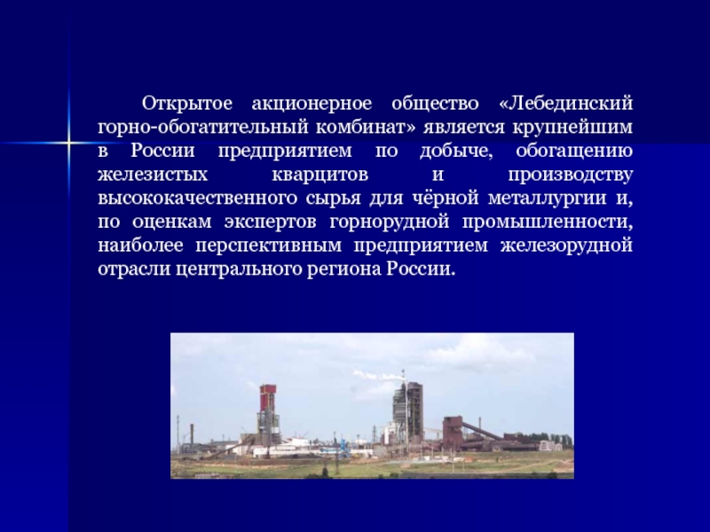 Слайд 4 Открытое акционерное общество «Лебединский горно-обогатительный комбинат» является крупнейшим в России предприятием