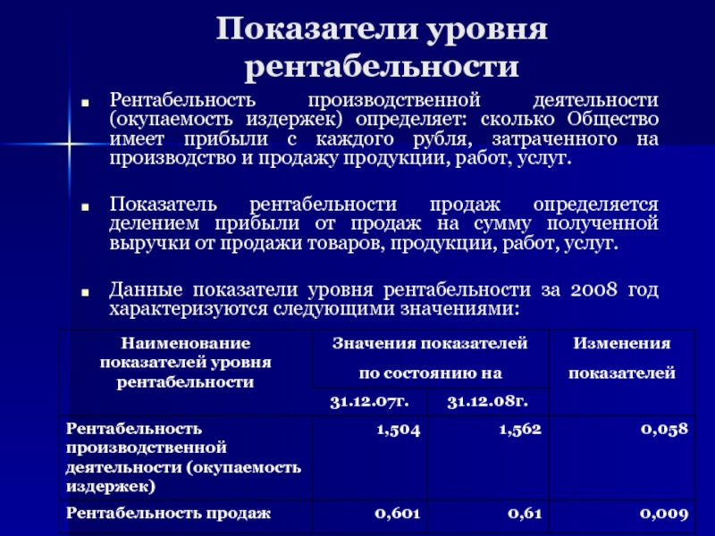 Данные показатели уровня рентабельности за 2008 год характеризуются следующими значениями: