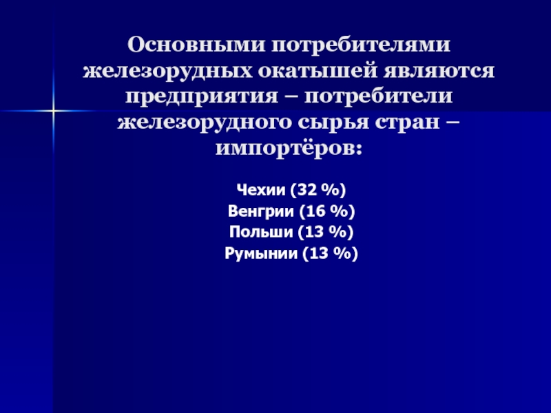 Слайд 20Основными потребителями железорудных окатышей являются предприятия – потребители железорудного сырья стран