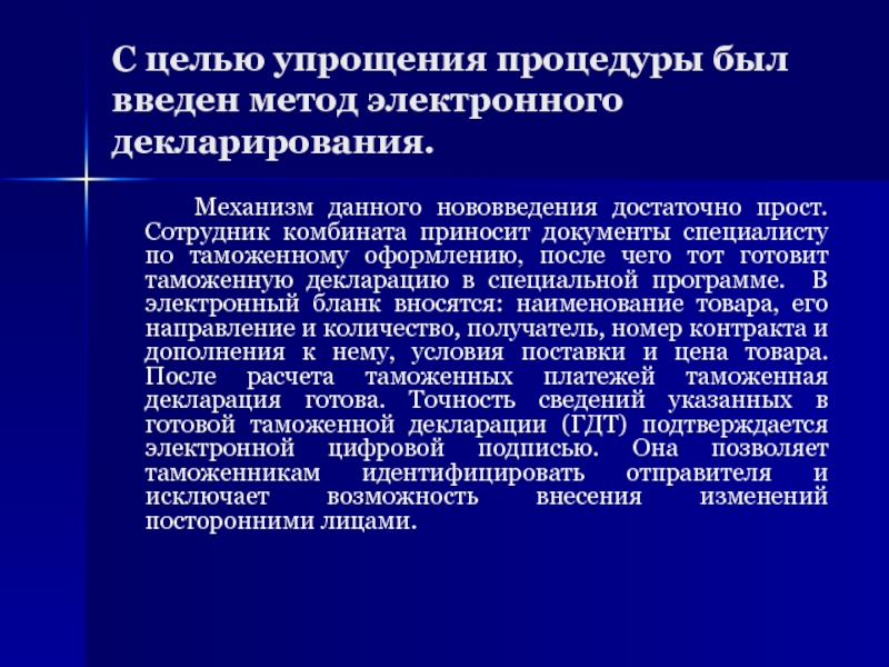 Слайд 14С целью упрощения процедуры был введен метод электронного декларирования.