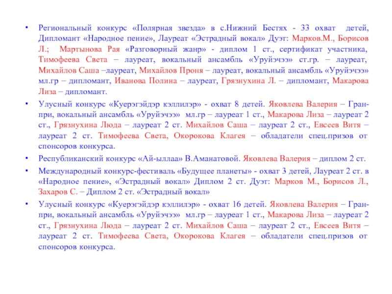 Дипломант «Народное пение», Лауреат «Эстрадный вокал» Дуэт: Марков.М., Борисов Л.; Мартынова Рая «Разговорный жанр» - диплом 1 ст., сертификат участника, Тимофеева Света – лауреат, вокальный ансамбль «Уруйэчээ» ст.гр. – лауреат, Михайлов Саша –лауреат, Михайлов Проня – лауреат, вокальный ансамбль «Уруйэчээ» мл.гр – дипломант, Иванова Полина – лауреат, Грязнухина Л. – дипломант, Макарова Лиза – дипломант.