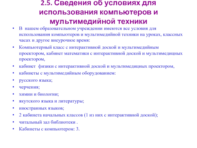 Слайд 202.5. Сведения об условиях для использования компьютеров и мультимедийной техники